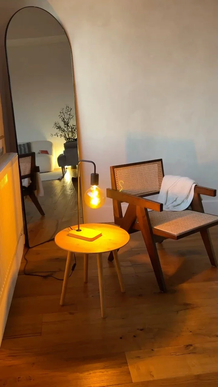 Ein gemütlicher Raum mit einem Holzstuhl, einem kleinen runden Beistelltisch mit einer Lampe, einer weißen Decke auf dem Stuhl, einem großen Spiegel, Holzfußboden und einem weißen Wandhintergrund.
